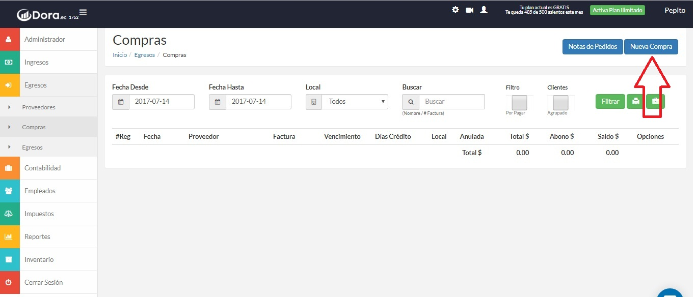 Ingresamos en la pestaña de compras y damos click al botón Nueva Compras