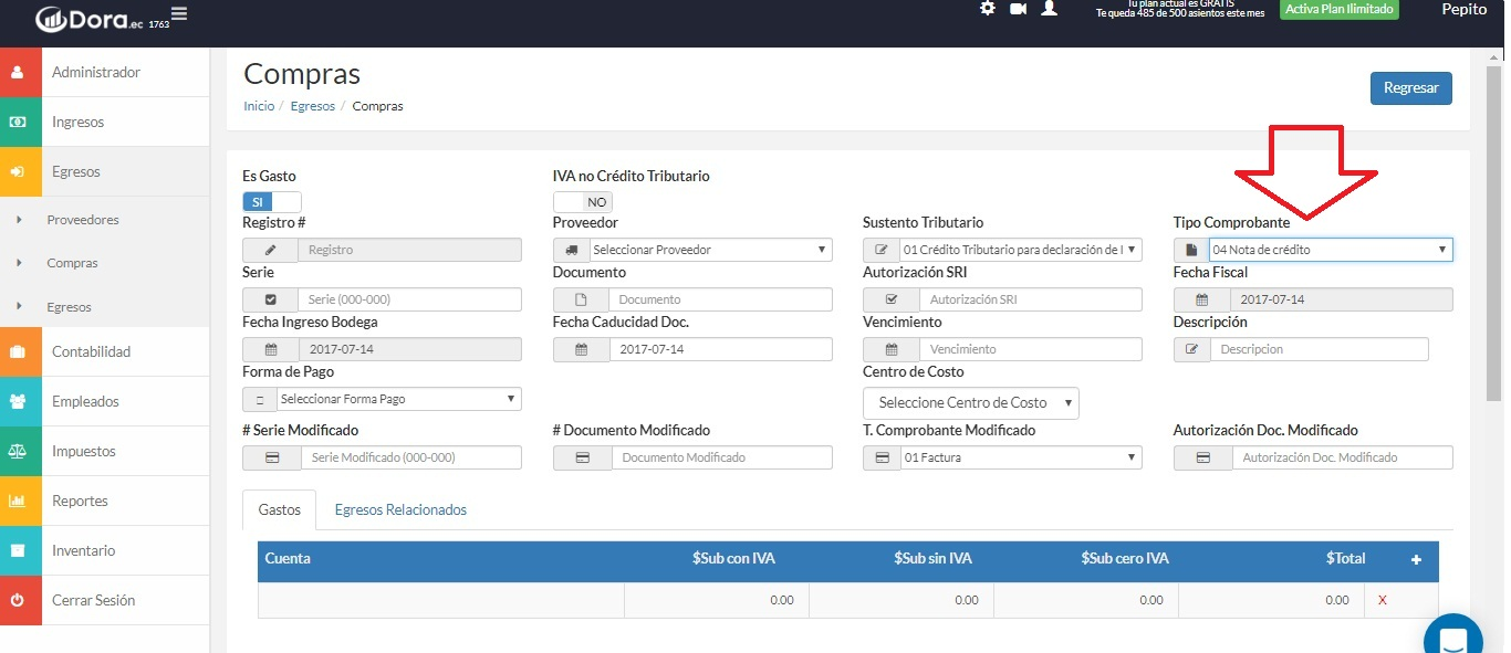 Descripción : Pasos para registrar una nota de crédito en compras.