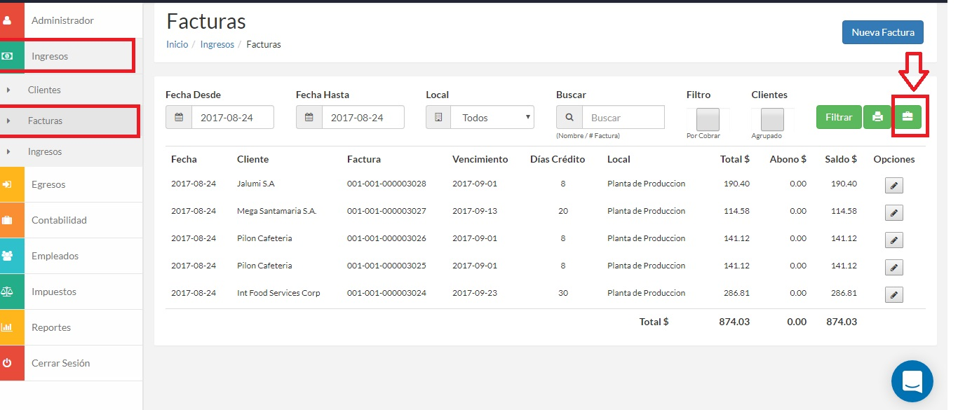 Vamos a la pestaña de "Ingresos", seleccionamos "Facturas", buscamos el rango de fecha que deseamos y luego damos click al botón verde (Imagen de Cartera) que esta ubicado al lado derecho de la pantalla.