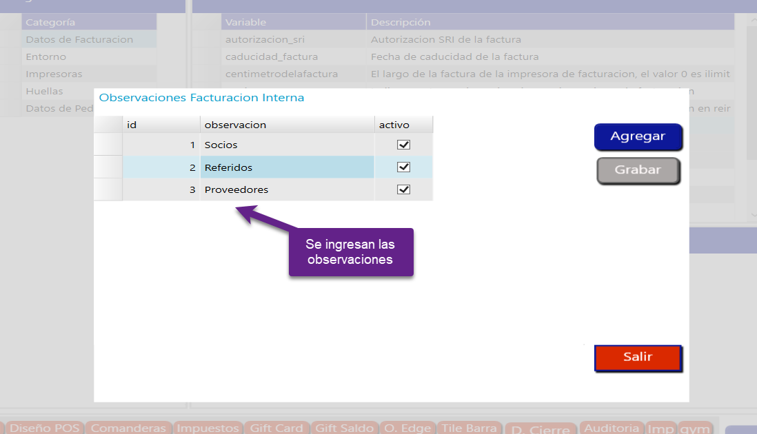 En este módulo puede ingresar o activar o desactivar las observaciones